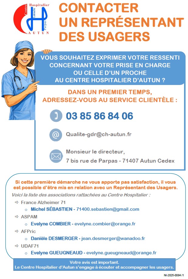 La loi du 6 janvier 1978 garantit la confidentialité des informations et vous permet d’exercer un droit d’accès et de rectification en adressant un courrier à Monsieur le Directeur du Centre Hospitalier d’Autun.