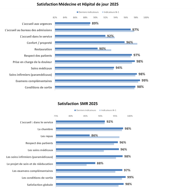 A noter aussi que l’établissement participe au dispositif national « e-Satis » pour la mesure de la satisfaction et de l’expérience des patients hospitalisés plus de 48h en médecine, chirurgie et obstétrique (MCO), ainsi que ceux pris en charge en chirurgie ambulatoire et en soins de suite et de réadaptation (SSR). Les résultats sont disponibles sur le site Qualiscope de la HAS.